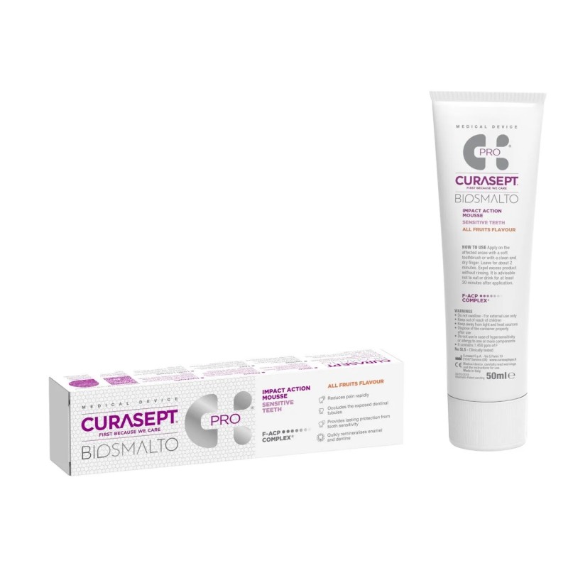 Mus Curasept Biosmalto Sensitive jest wyrobem medycznym, który służy do intensywnej remineralizacji uszkodzonego szkliwa i zębiny. Skutecznie i szybko zmniejsza ból zębów wrażliwych. Zawarte w nim substancje funkcjonalne (F-ACP Complex) pobudzają naturalne procesy remineralizacji i odbudowy. W ten sposób na zębach zostaje utworzona nowa, dużo bardziej odporna na czynniki zewnętrzne warstwa mineralna. Mus jest szczególnie polecany dla osób, które zmagają się z silną nadwrażliwością zębów, w przypadku ubytków w szkliwie spowodowanych zgrzytaniem zębami (bruksizm). Produkt doskonale sprawdzi się także w trakcie leczenia ortodontycznego oraz w kserostomii. Mus cechuje się bardzo szybkim i skutecznym działaniem. Zawiera fluor w ilości 1450 ppm F-.
