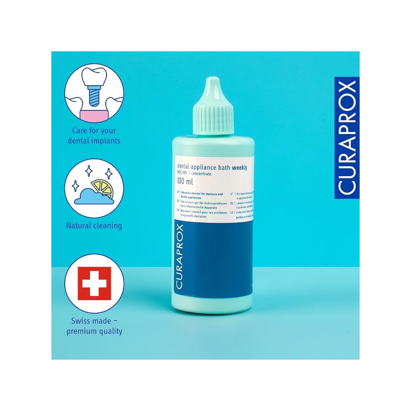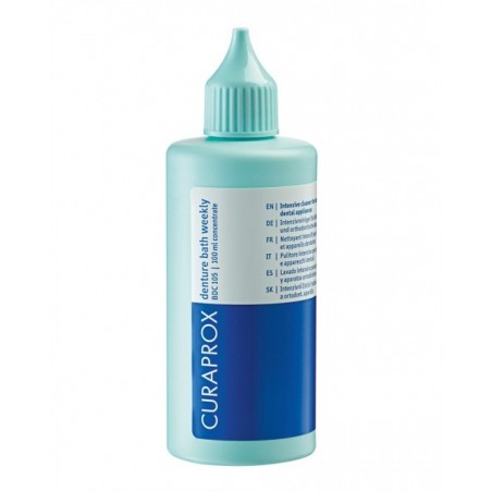 Koncentrat Curaprox BDC 105 Weekly polecany jest do co tygodniowej, intensywnej higieny jamy ustnej. Koncentrat delikatnie czyści i dezynfekuje protezę przynosząc długotrwałe uczucie świeżości.